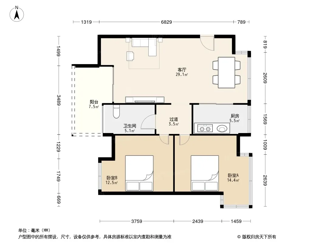 户型齐全,主打户型方正,明厨,客厅朝南,主卧朝南二居