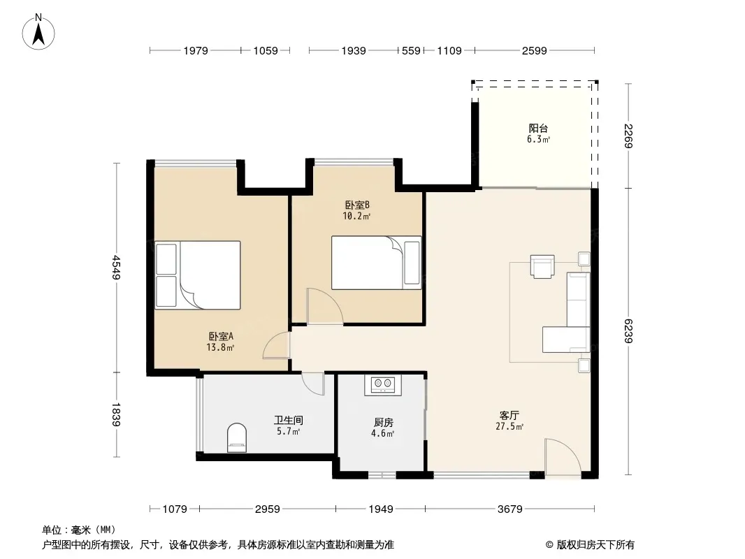 户型齐全,主打户型方正,明厨,客厅朝南,主卧朝南二居