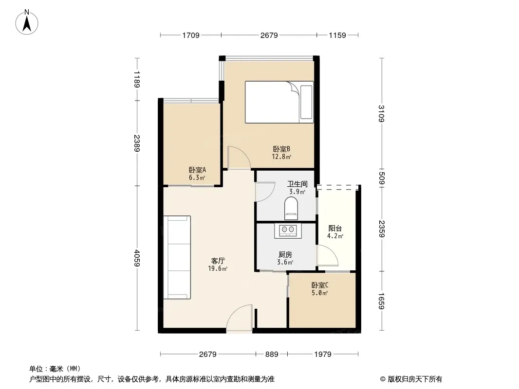 户型方正,通风采光好,三室一厅一厨一卫,空间大
