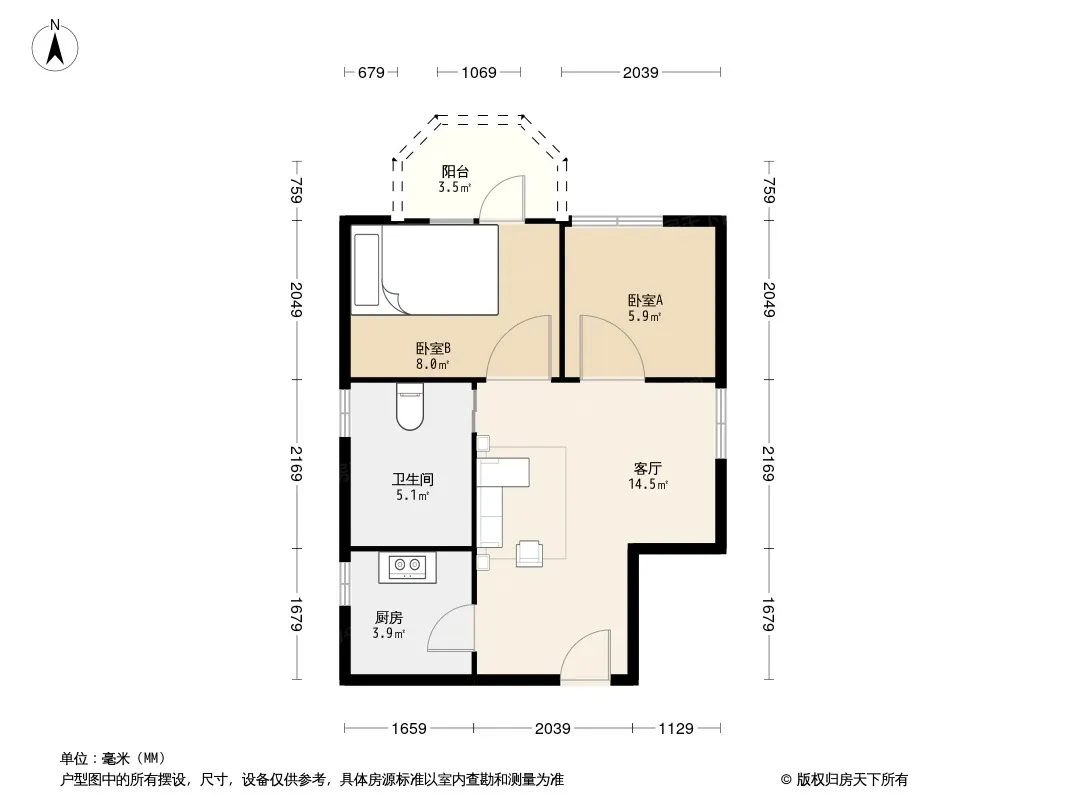 户型齐全,主打明厨,明卫,客厅朝南,全明格局,主卧朝南二居