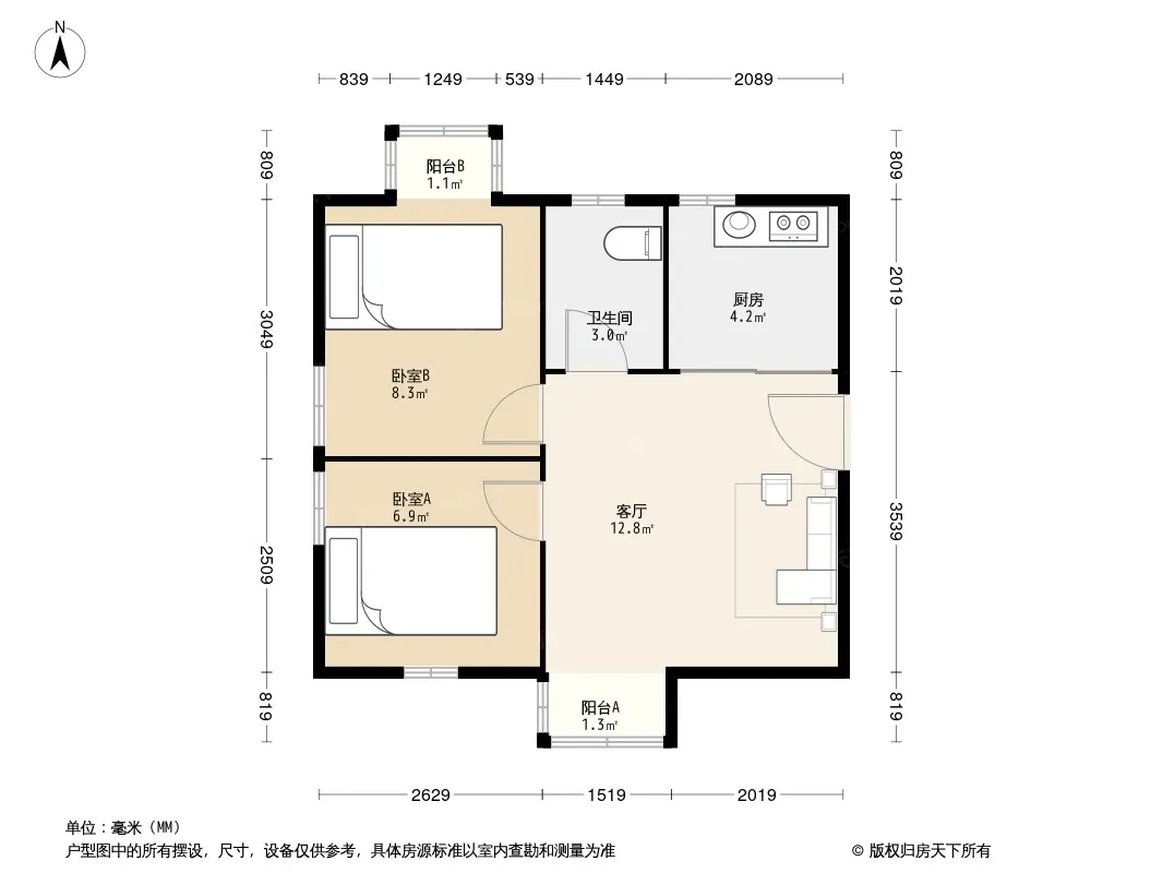 户型齐全,主打明厨,明卫,客厅朝南,全明格局,主卧朝南二居
