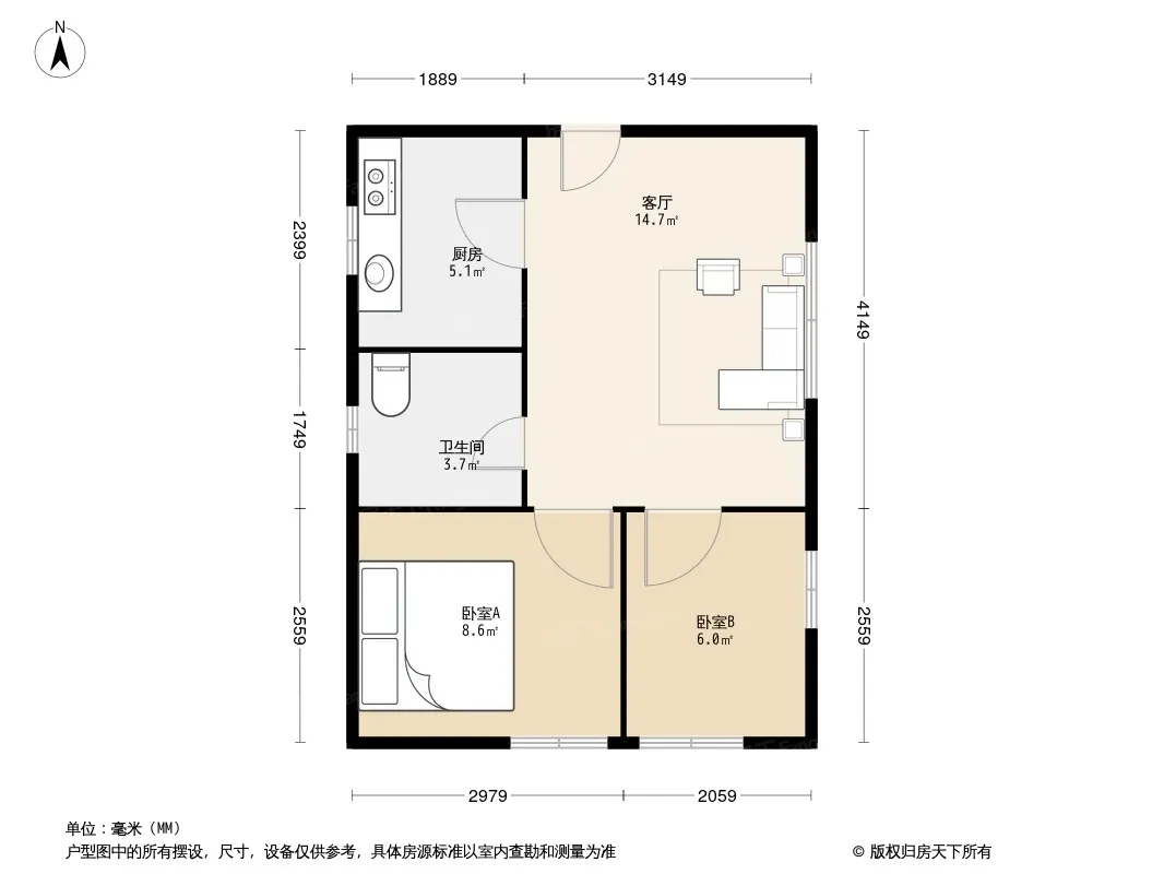 户型齐全,主打明厨,明卫,客厅朝南,全明格局,主卧朝南二居