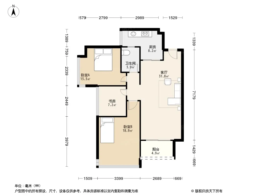 户型齐全,主打户型方正,明卫,明厨,独立衣帽间,双卧朝南,主卧朝南三居