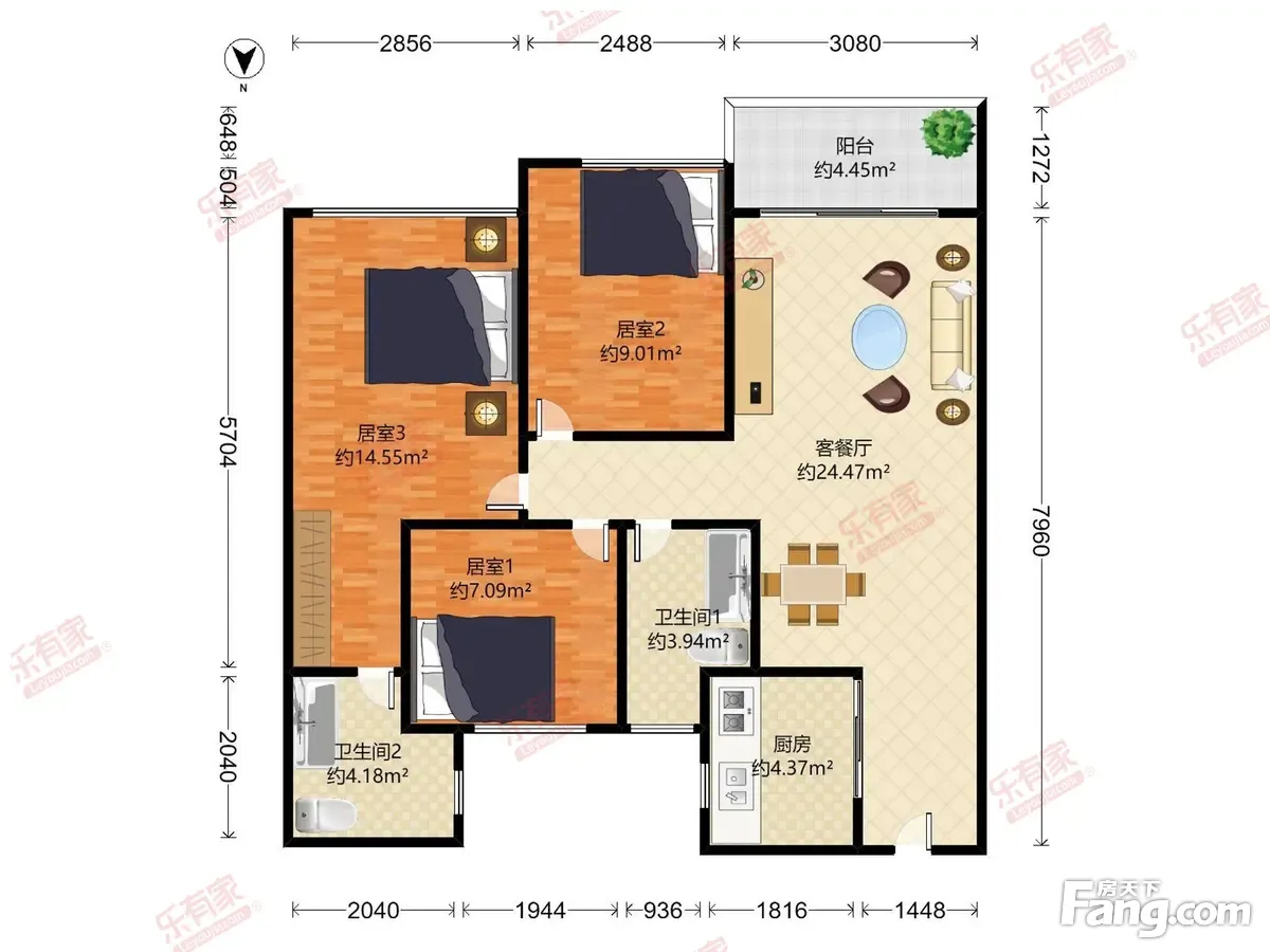 心海城 3房2厅2卫 88.47㎡
