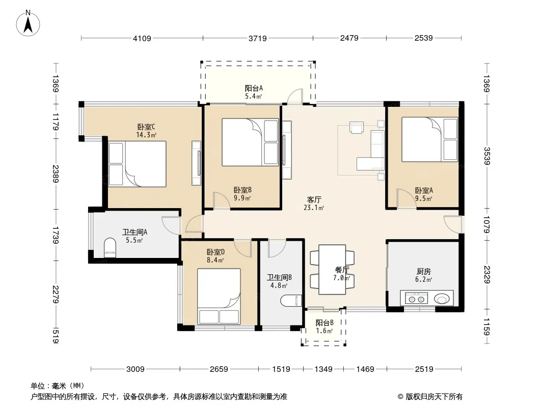 户型齐全,主打主卧带卫,厨卫不对门,户型方正,客厅朝南,主卧朝南四居