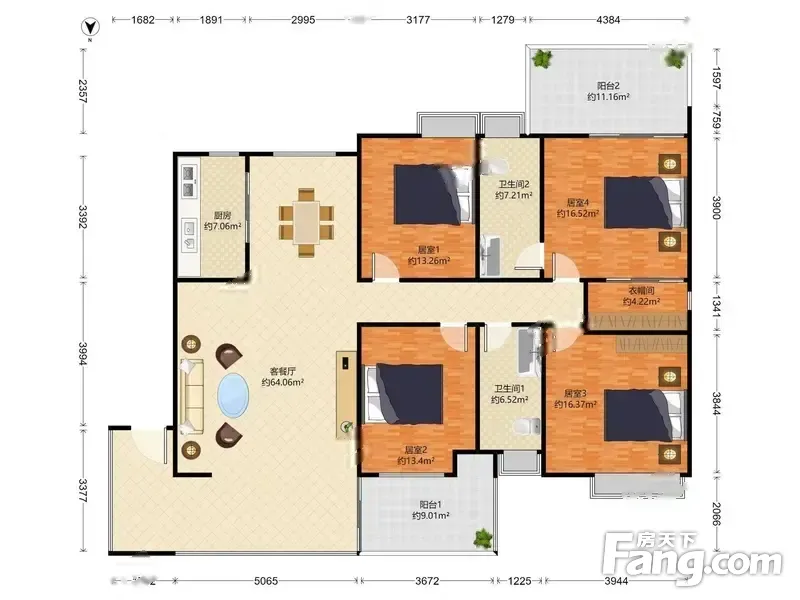 户型齐全,主打独立衣帽间,客厅朝南,双阳台四居