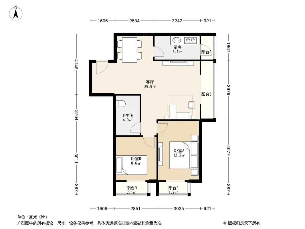 户型齐全,主打户型方正,客厅朝南,主卧朝南二居