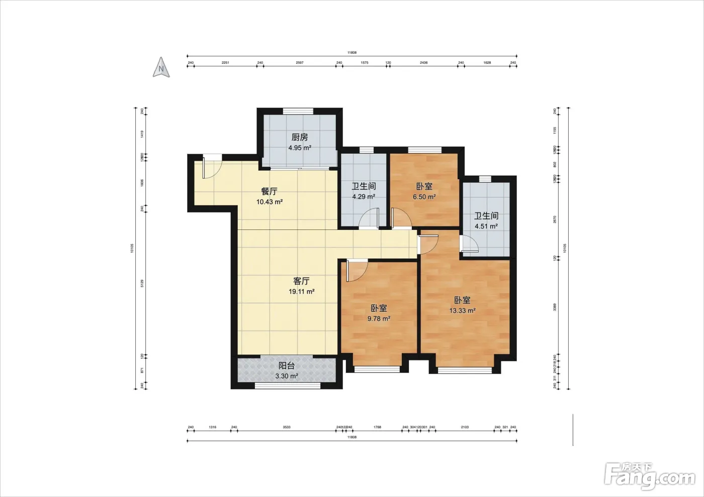 南北通透三室两厅两卫 全明户型