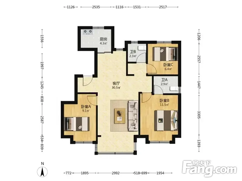 户型齐全,主打南北通透,采光充足,客厅朝南,主卧带卫,明厨,明卫三居