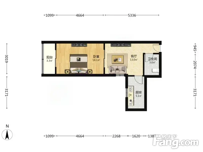 此房正规一室一厅一卫 卧室是标准房间带阳台 ,厨房卫生间都很方正,整齐布局合理,无浪费面积,住着舒服。产权清晰