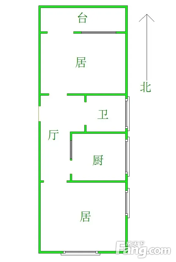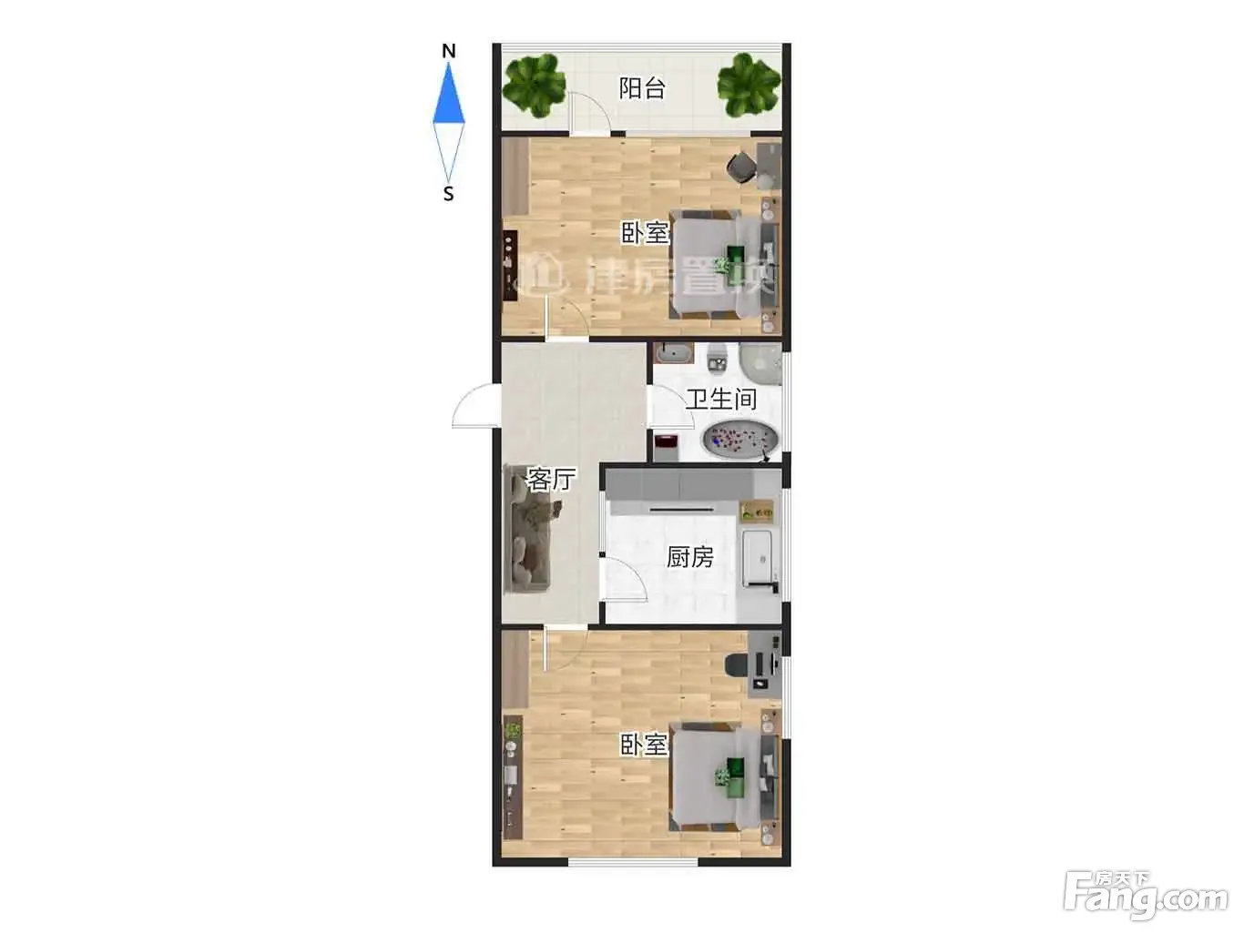 建筑面积44.37平米,为南北朝向的两室一厅户型,采光通风俱佳