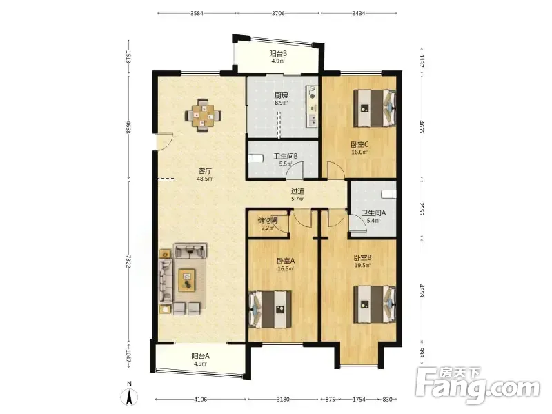 此房正规三室两卫 南北通透 两个阳面卧室都是标准房间 主卧室出台带卫生间 一个阴面卧室很方正,厨房有窗户,客卫很大干湿分离洗衣机洗脸盆互不影响。客厅宽敞明亮大气,整齐布局合理,无浪费面积,适合三代同堂居住,