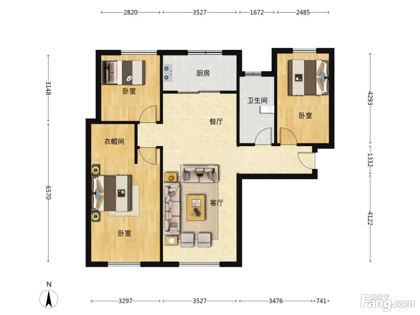 南北通透三室两厅两卫 全明户型