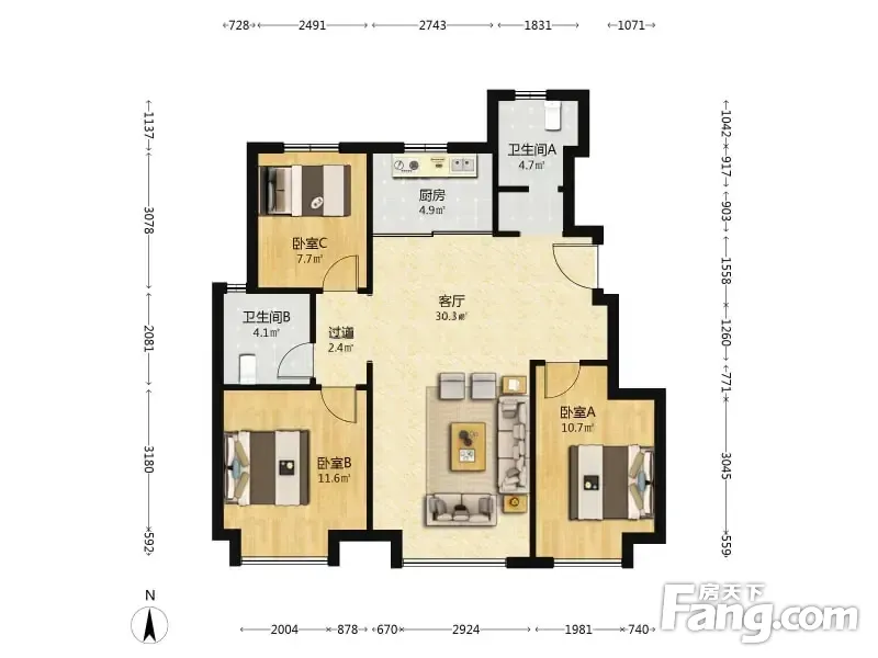 户型齐全,主打南北通透,全明格局,户型方正三居