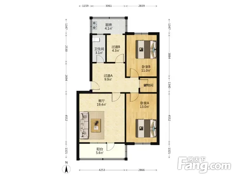 户型齐全,主打户型方正,明厨,客厅朝南,主卧朝南二居