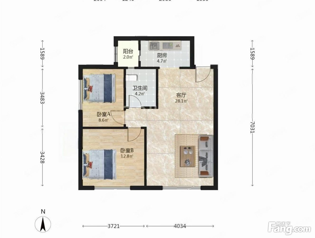 户型齐全,主打明厨,客厅朝南,主卧朝南二居