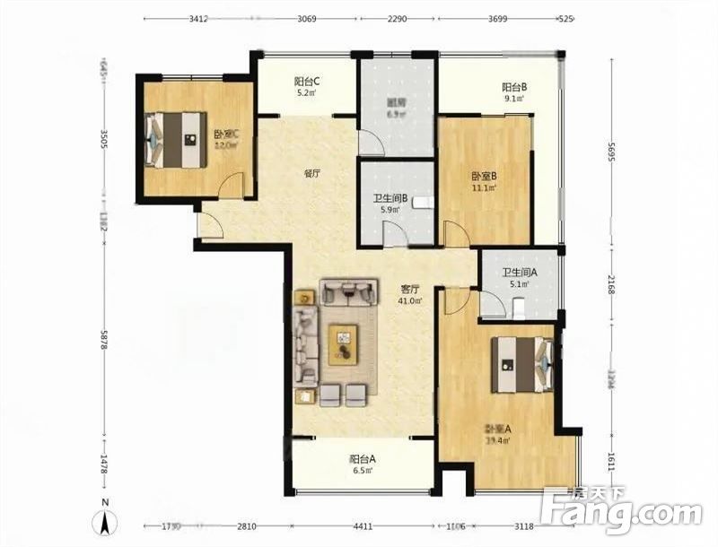 户型齐全,主打户型方正,明卫,明厨,客厅朝南,全明格局,双卧朝南三居