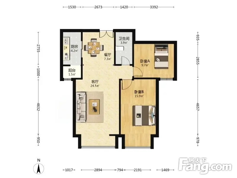户型齐全,主打独立衣帽间,客厅朝南二居