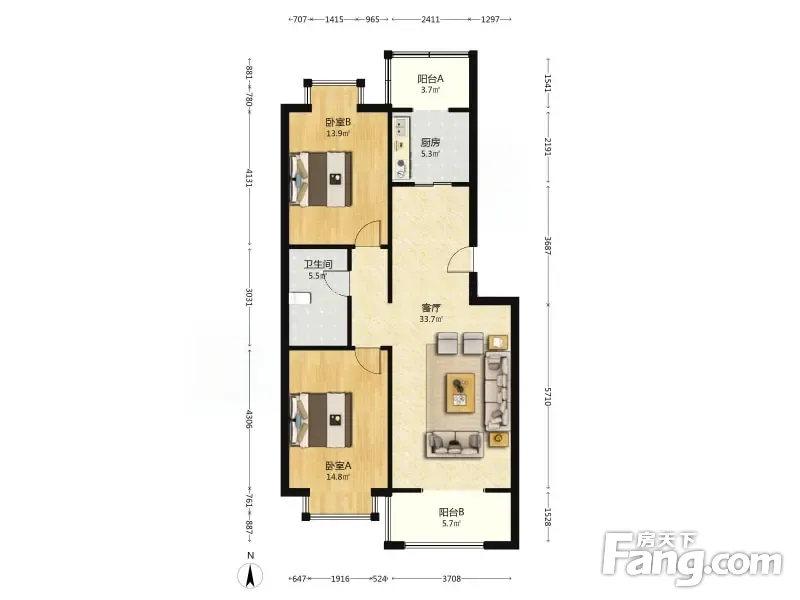户型齐全,主打户型方正,明厨,客厅朝南,主卧朝南二居