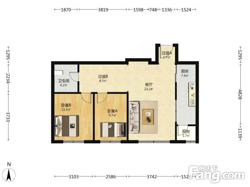 户型齐全,主打户型方正,明卫,客厅朝南,双卧朝南二居