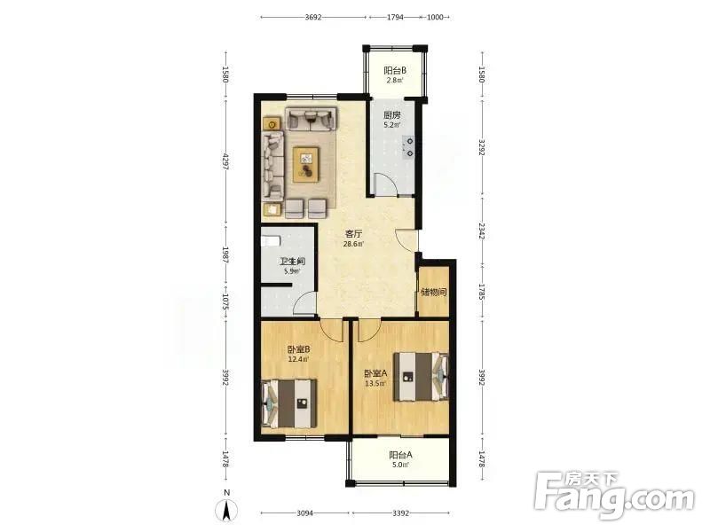 户型齐全,主打户型方正,明厨,主卧朝南二居