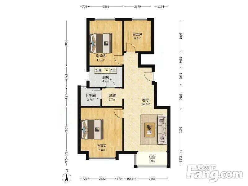 龙湖天宸原著 3室1厅 92.16平
