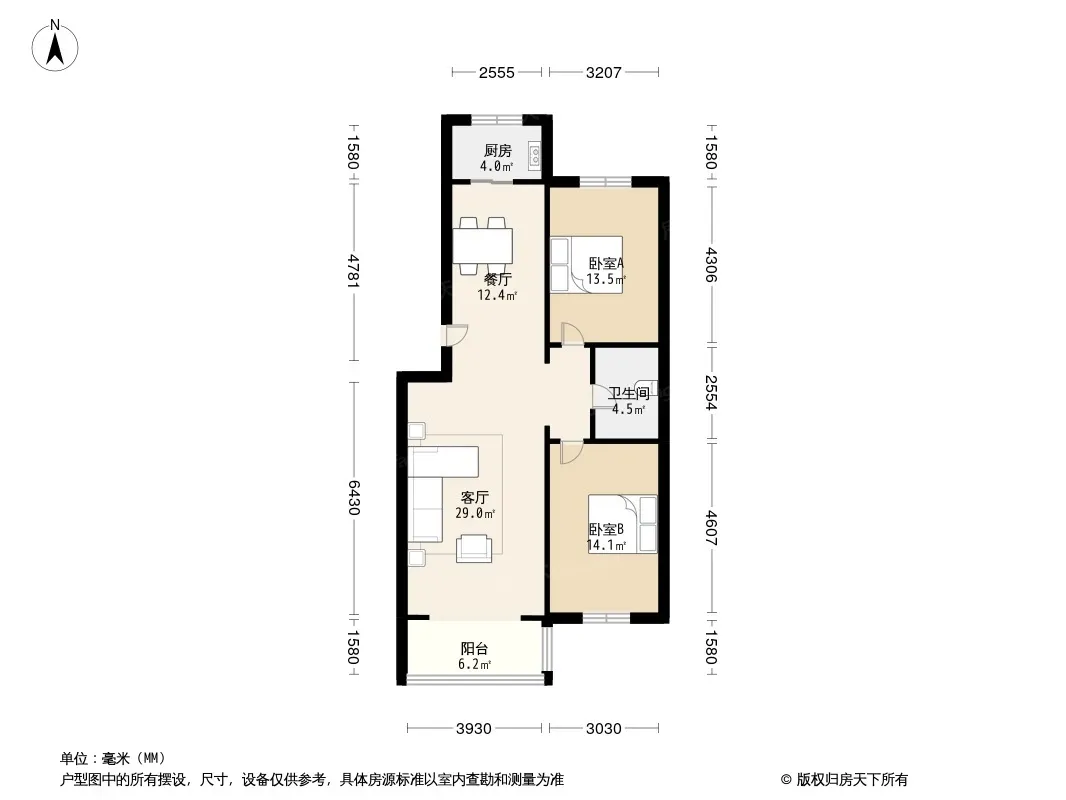 户型齐全,主打户型方正,明厨,客厅朝南,主卧朝南二居
