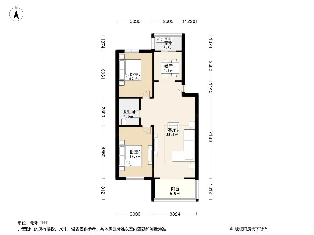 户型齐全,主打户型方正,明厨,客厅朝南,主卧朝南二居