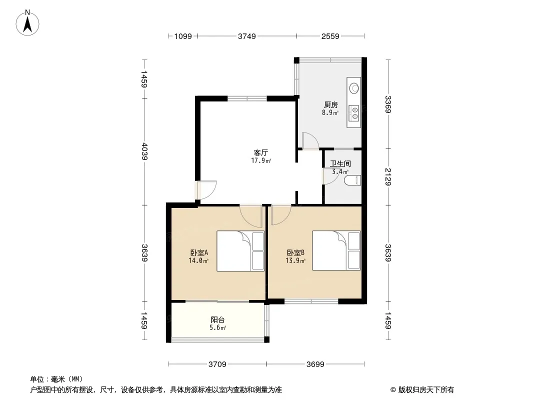 户型齐全,主打明厨,客厅朝南,主卧朝南二居