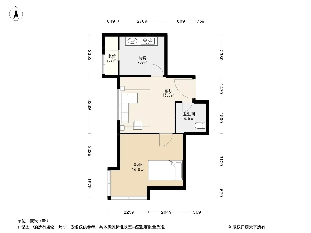 户型齐全,主打户型方正,明厨,客厅朝南,主卧朝南一居