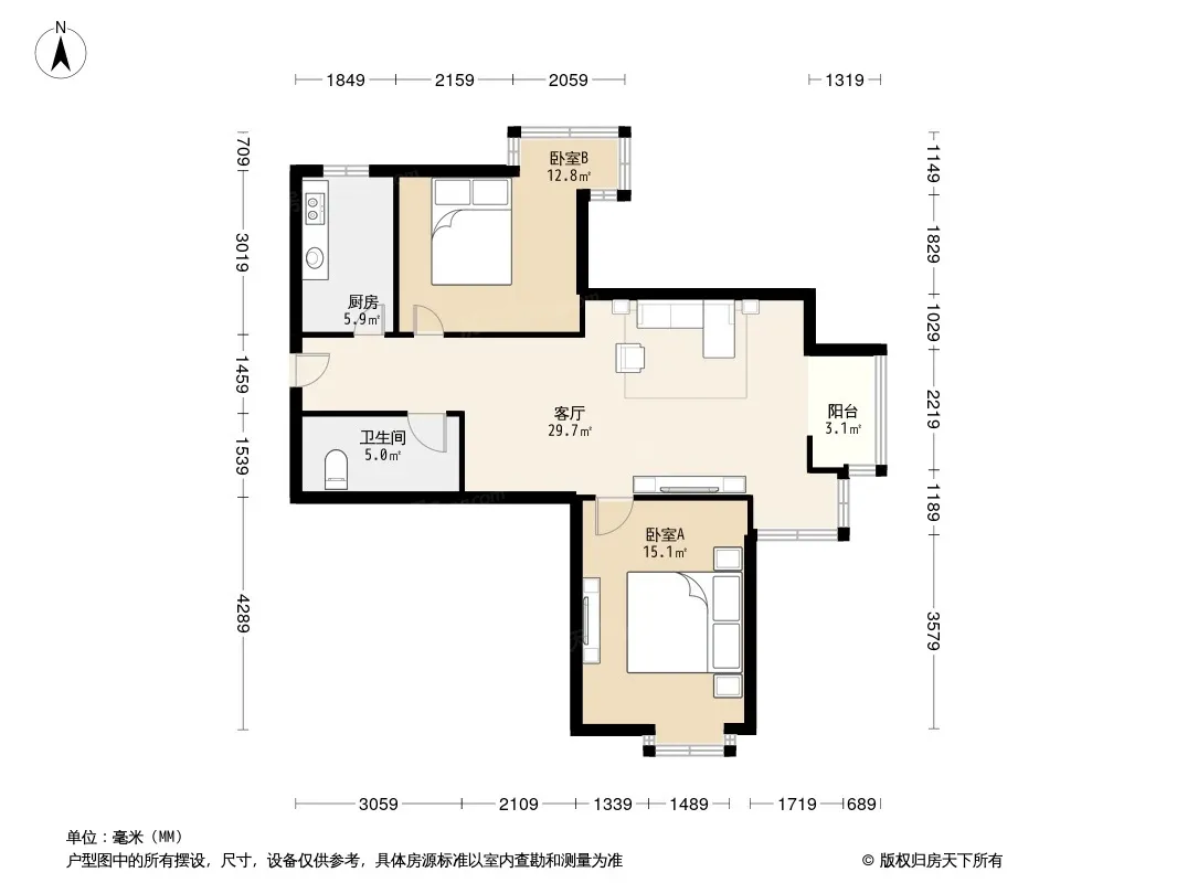 户型齐全,主打户型方正,明厨,客厅朝南,主卧朝南二居