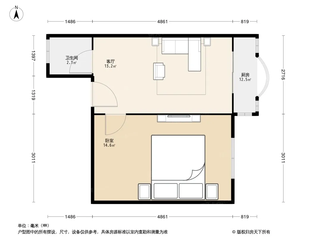户型齐全,主打户型方正,明厨,客厅朝南,主卧朝南一居
