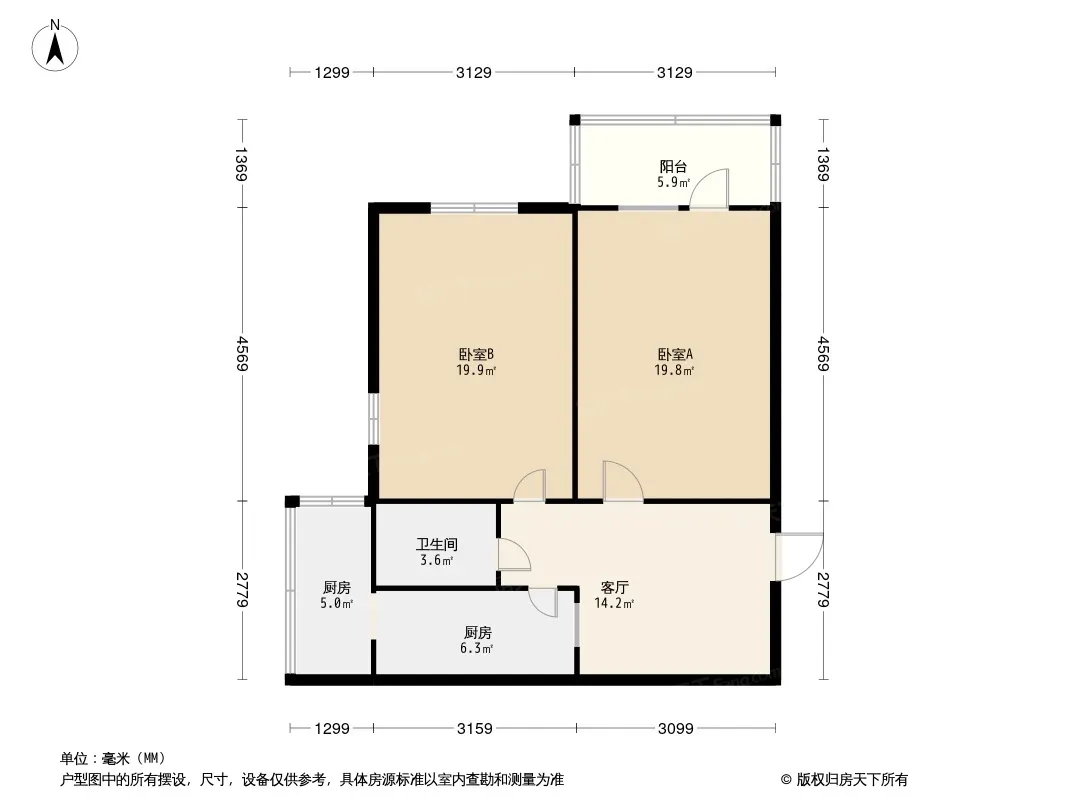 户型齐全,主打明厨,明卫,客厅朝南,全明格局二居