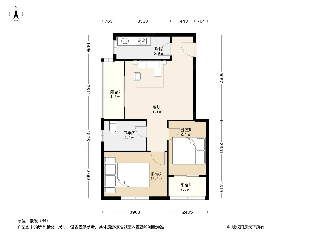 户型齐全,主打明厨,双阳台,明卫,客厅朝南二居