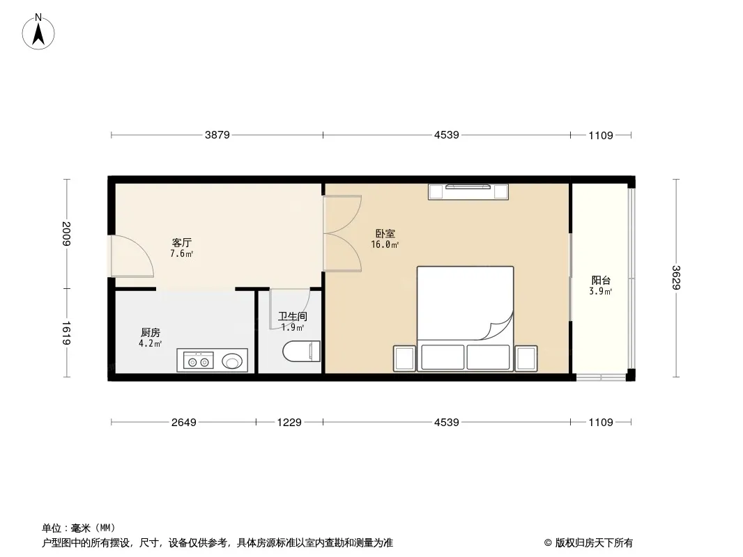 户型齐全,主打户型方正,明厨,客厅朝南,主卧朝南一居