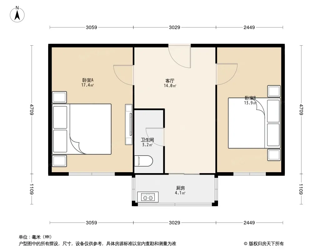 户型齐全,主打户型方正,明厨,客厅朝南,双卧朝南二居