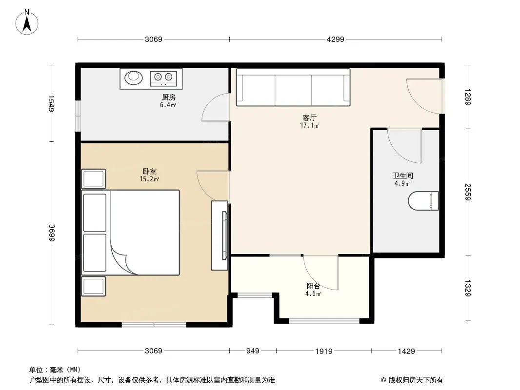 户型齐全,主打户型方正,明厨,客厅朝南,主卧朝南一居
