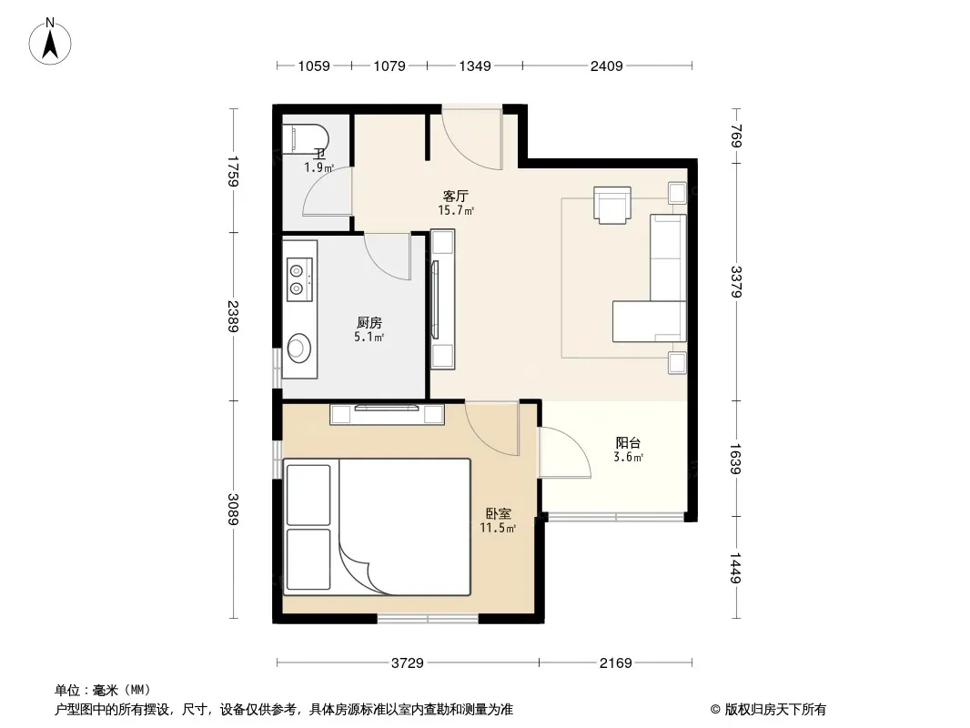 户型齐全,主打户型方正,明厨,客厅朝南,主卧朝南一居