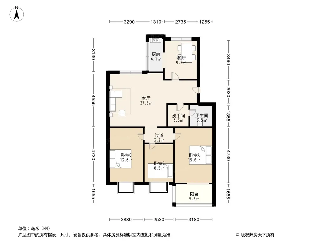 户型齐全,主打明厨,客厅朝南,主卧朝南,独立衣帽间三居