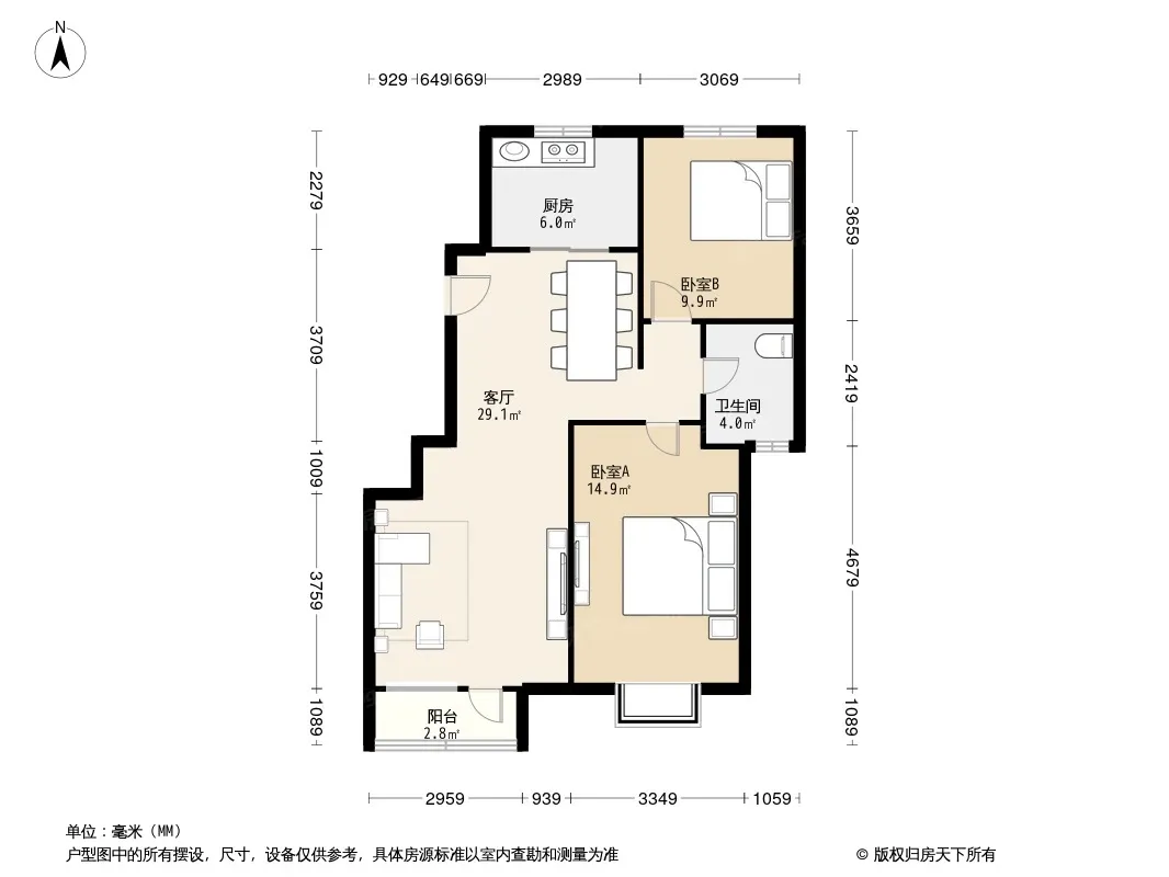 户型齐全,主打户型方正,明厨,明卫,客厅朝南,全明格局,双阳台,主卧朝南二居