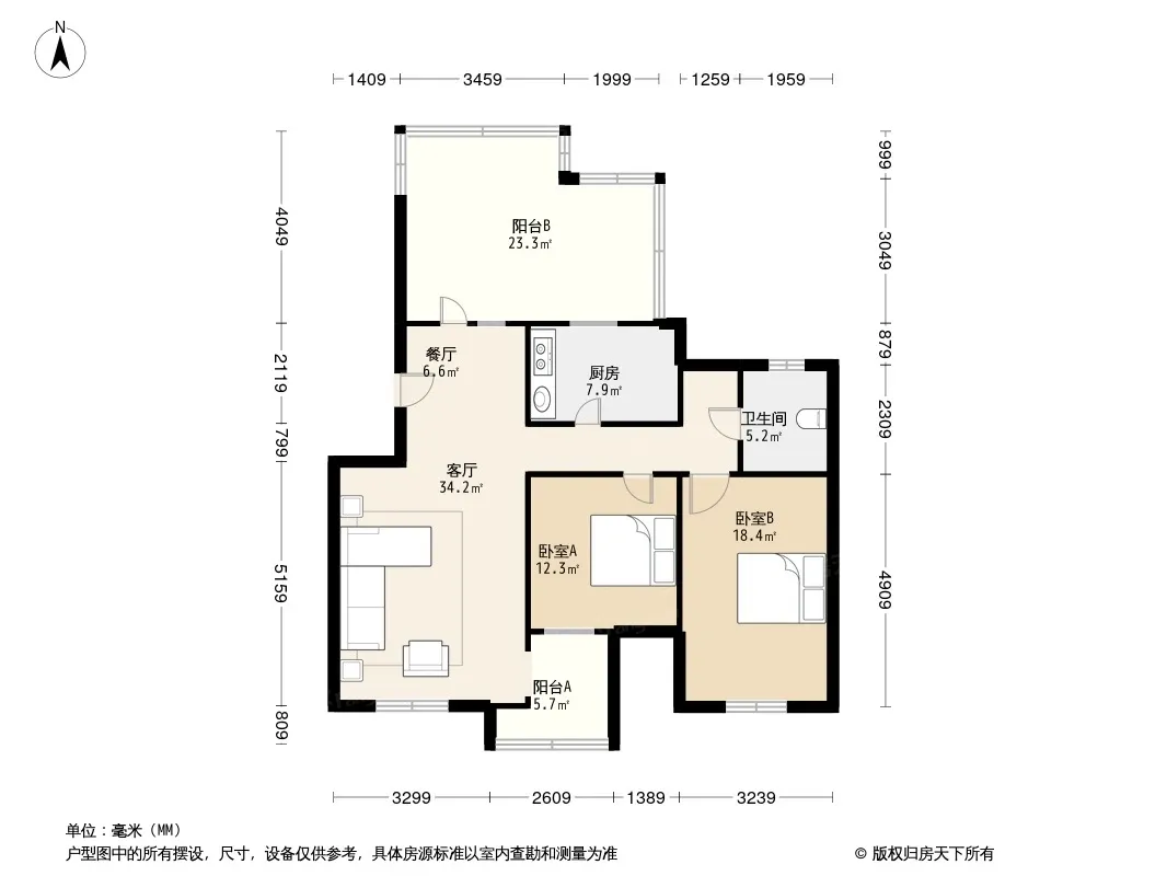 大两室,采光充足,居住舒适,户型方正。