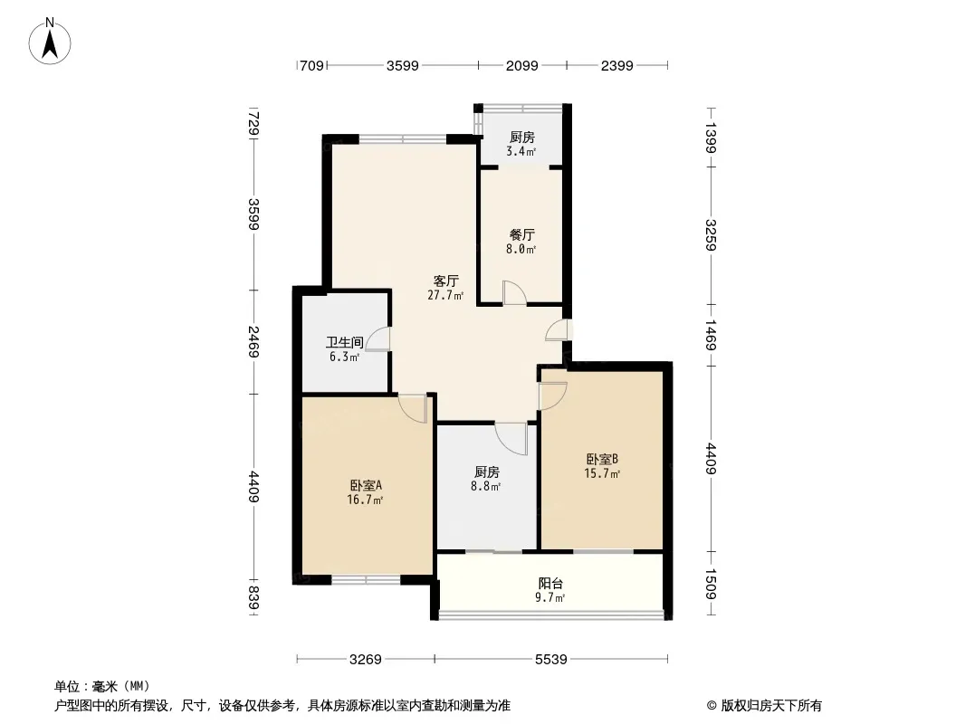 户型齐全,主打户型方正,明卫,明厨,主卧朝南二居