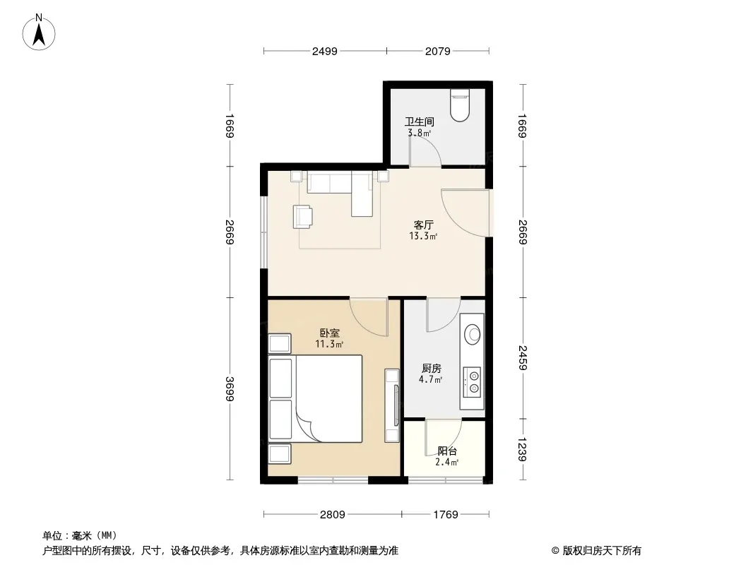 户型齐全,主打户型方正,明厨,客厅朝南,主卧朝南一居