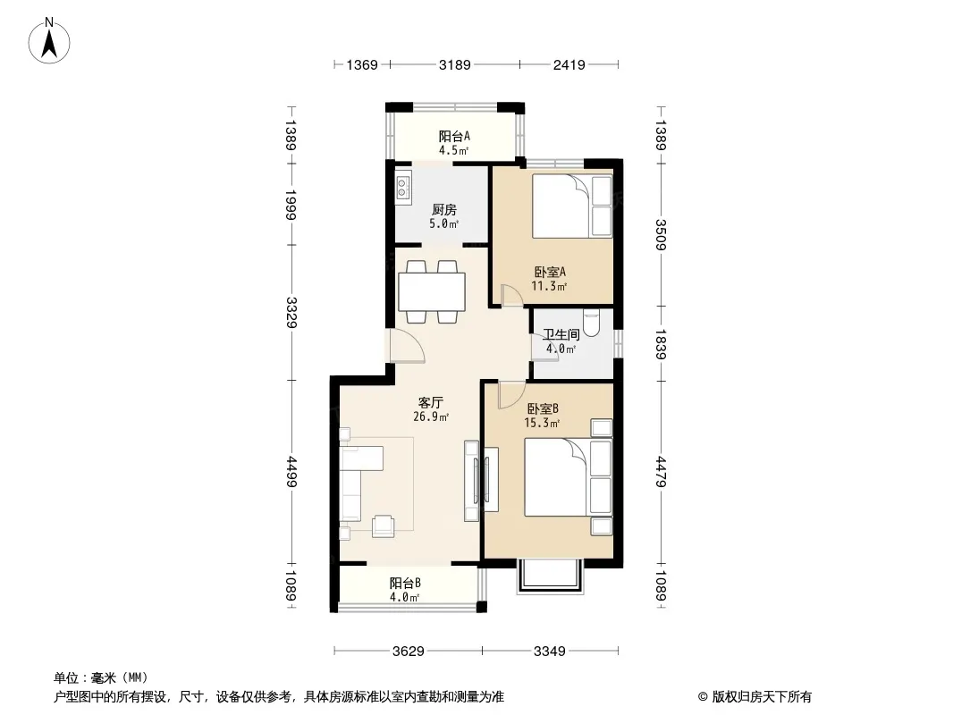 户型齐全,主打明厨,客厅朝南,主卧朝南二居