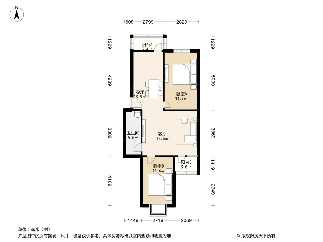 户型齐全,主打户型方正,明厨,客厅朝南,主卧朝南二居