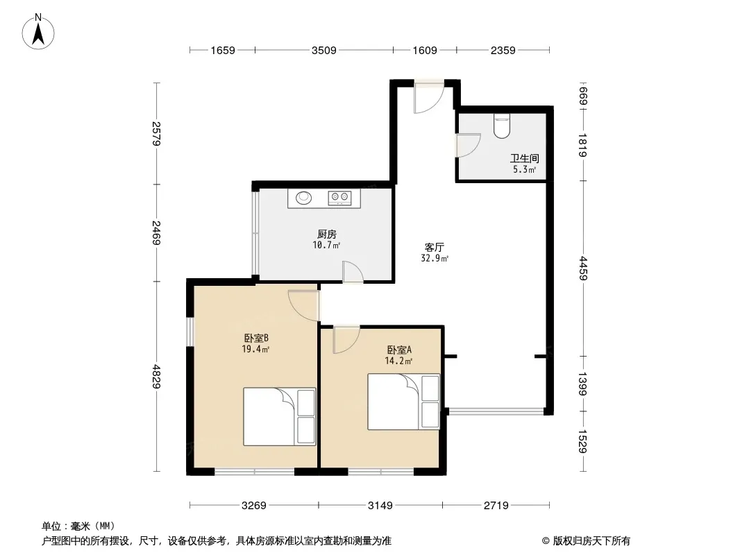 户型齐全,主打户型方正,明厨,客厅朝南,主卧朝南二居