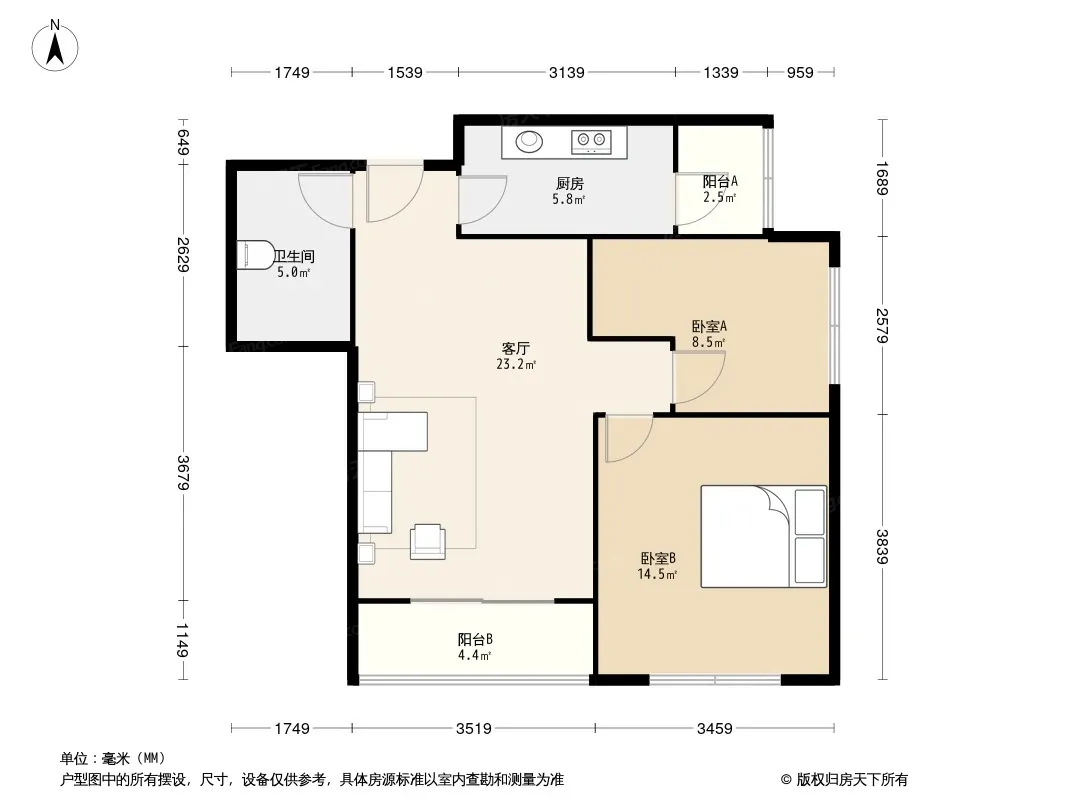 户型齐全,主打户型方正,明厨,客厅朝南,主卧朝南一居