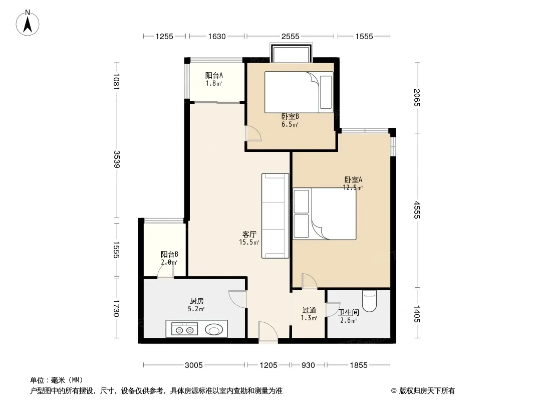 户型齐全,主打户型方正,双阳台,双卧朝南,主卧朝南二居