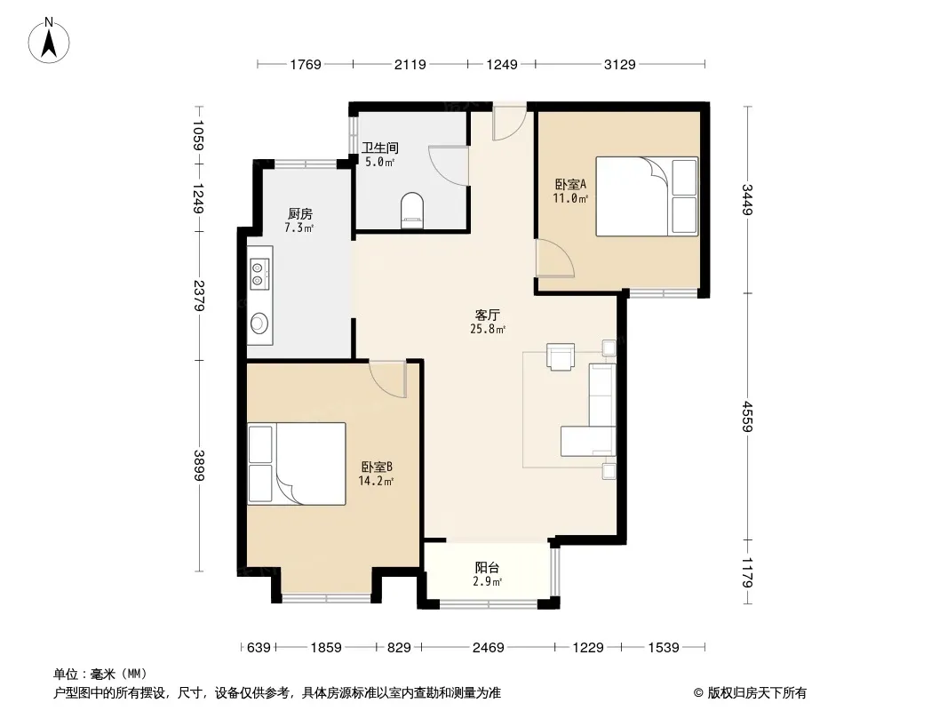 户型齐全,主打户型方正,明厨,明卫,双卧朝南,主卧朝南二居