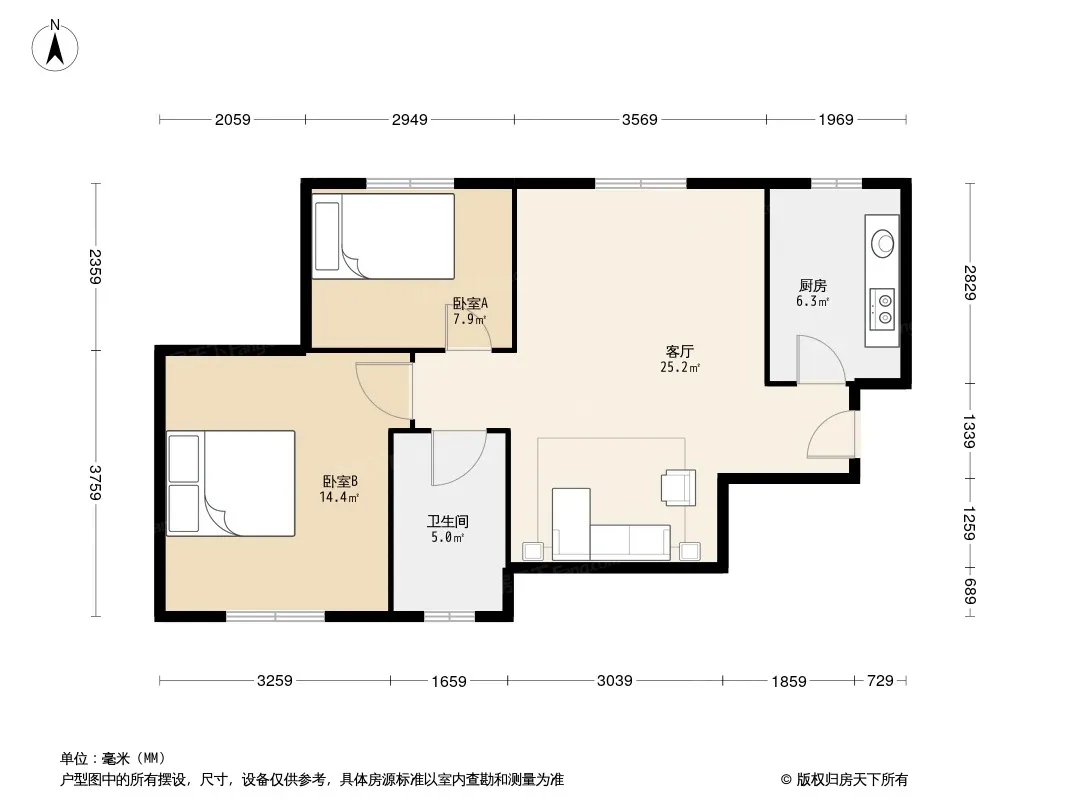 户型齐全,主打户型方正,明厨,客厅朝南,主卧朝南二居